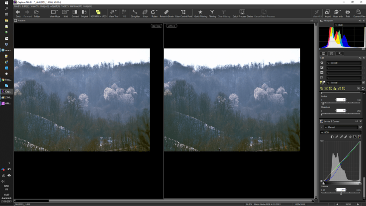 For the second editing try I ended up with Black and White. Above is how the curved applied influenced the histogram from initial state in blue rectangle to final state in orange rectangle. The curved is decreasing the shadows even more until the histogram is pushed all way to black limit. Is also decreasing the contrast for the forest in the foreground. What I observed is that for photos with lot of detail (like a forest) or for for situation were I do not like my photos, I can try a black and white option that just looks better than with colors.
