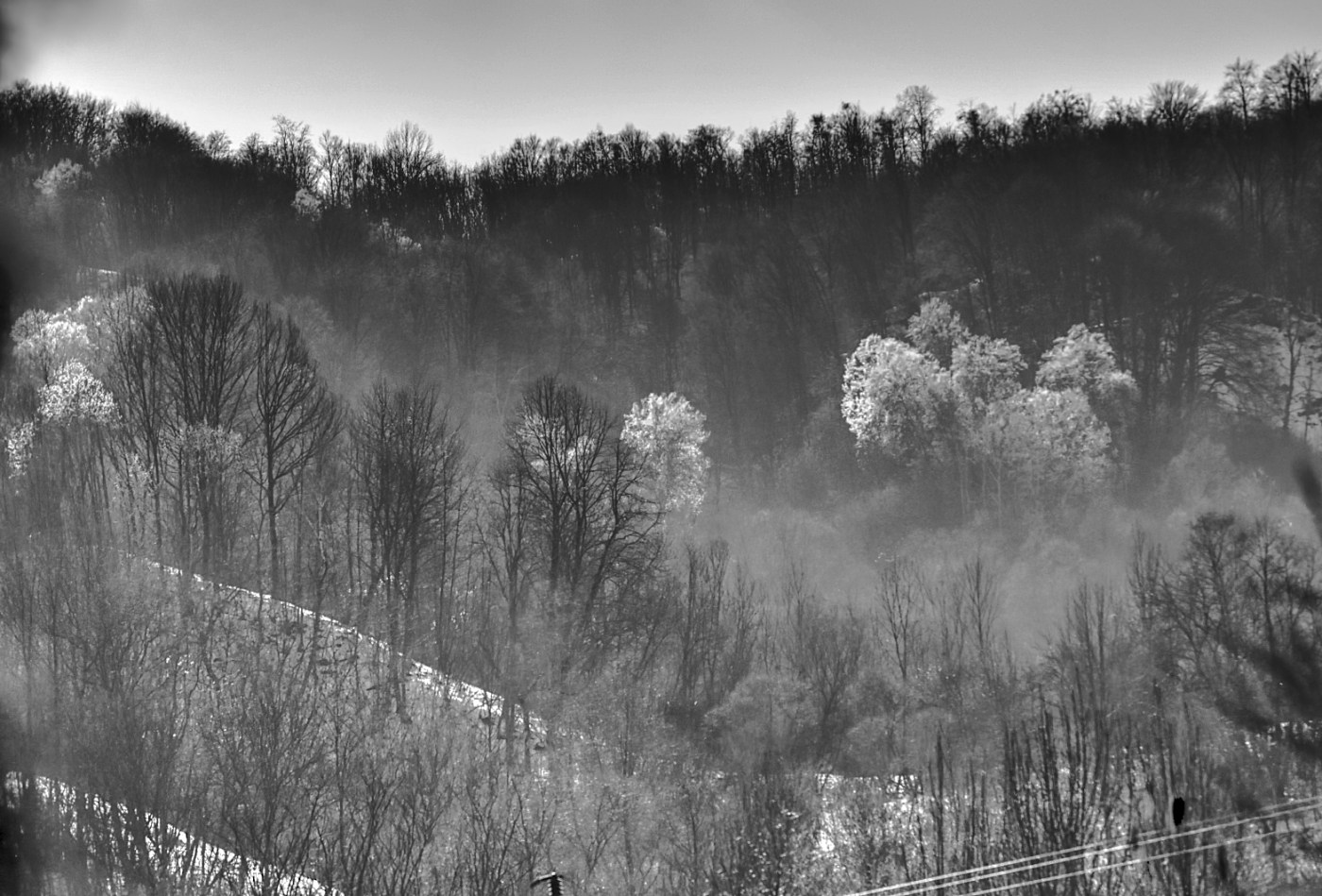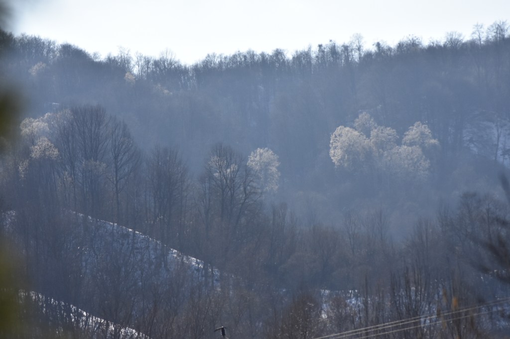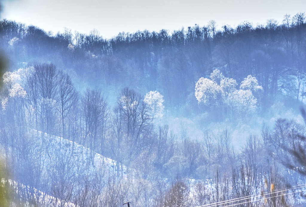 It was one hour before the golden hour in middle of March and I saw some of the trees in distant forest that were diffusing this white light in contrast with their surroundings. The light was caused by the white flowers in their corona. The shadows that the trees cased were aligned downhill as the sun was setting behind the forest hill. I see now that this detail is not capture in the photos. Also present was a haze visible I think because of the sun low altitude that was observed in between the trees. In my photo this is more visible in between the foreground( middle – left) and background trees in upper right. I liked the curves in white given by the snow in the lower left, as they make a frame around the distant white trees. I thought about to have more photos with different exposure as to extract more information from shadows, either by increasing the exposure in post processing or even try a HDR.